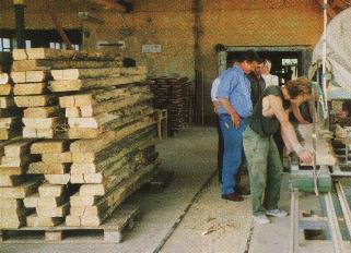 Na de selectie op bruikbaarheid, wordt het hout vervoerd naar de zagerijen. Hier wordt het hout op delen gezaagd. Langzaam terugdrogen tot 25% alvorens er balken uitgezaagd gaan worden.