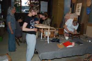 Meestal begint het als er ergens een stoel wordt "gevonden" maar er een beschadiging in de zitting wordt geconstateerd. Zonde om weg te gooien, maar laten repareren net te duur? Dan is zel doen een leuke hobby en een nieuwe uitdaging tegelijkertijd. Daarom willen de mensen het liefst hun eigen stoel meenemen om daarop te leren. Maar soms zijn dat zulke gecompliceerde matten, dat dit niet de juiste stoel is om het op te leren. Om teleurstelling te voorkomen, maakt u een drie fotoos, boven; onder en achter en mailt die fotoos naar Renate.. Zij zal u vertellen of de stoel geschikt is voor de cursus. het liefst een vlakke zitting. Het makkelijkst is een rechthoek, vierkant of trapezium met tegenover elkaar het zelfde aantal gaatjes. Moeilijker wordt het met een trapezium met verschillend aantal gaatjes boven en onder. En toch wel heel lastig is een ronde mat. Extra moeilijk kan het zijn de achterkant en/of de zijkanten niet vrij is en je er slecht bij kunt.