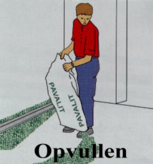Nadat de "rupsen" zijn gelegt en de latten op hoogte zijn gejusteerd, kan de overige vlakte worden opgevuld. Dit dient zodanig te gebeuren dat niet in de Pavalit gelopen wordt! Dit ter voorkoming van ongelijke verdichting.