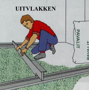 Afhankelijk van de te gebruiken rei-lat en rei-rails is de hoogte uitgezet. Deze is 10% hoger als de benodigde hoogte. Hierbij zou het kunnen zijn dat de rei-railsen geheel BOVEN de Pavalit liggen. Naast de hierboven afgebeelde rei-lat en -rails zou het ook kunnen zijn dat er gebruik gemaakt wordt van gewone latten en een rechte lat als rei. Overtuig U ervan dat deze ook werkelijk recht is! Bij deze laatste ligt de bovenzijde van de rei-railsen gelijk aan de benodigde hoogte. De lat ligt dan geheel in de Pavalit. Dit vraagt extra handigheid om de overtollige Pavalit te verdelen.
