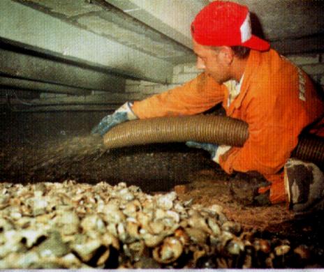 Bij bestaande vloeren is het storten van schelpen een intensieve klus. Met grote slangen kunnen de schelpen vanuit de wagen, door middel van lucht, onder de vloer gebracht worden.